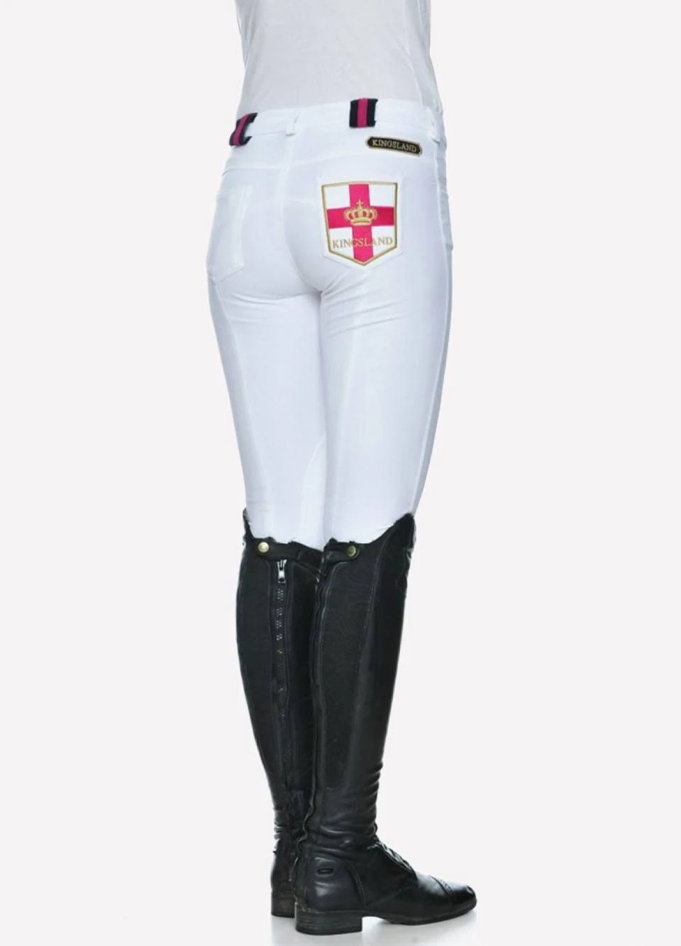 These recognisable breeches from Kingsland are sporty, modern and super stylish! Very popular amongst our showjumping customers, they are made from a high quality Schoeller fabric, and are very fitted and flattering. With striking flag detailing on the back pocket, and contrasting chunky belt loops on the waistband, they will definitely catch some eyes! They also feature Kingsland logo embroidery to the front on top of the leg. We feel these gorgeous breeches are best suited to competition wear!Â