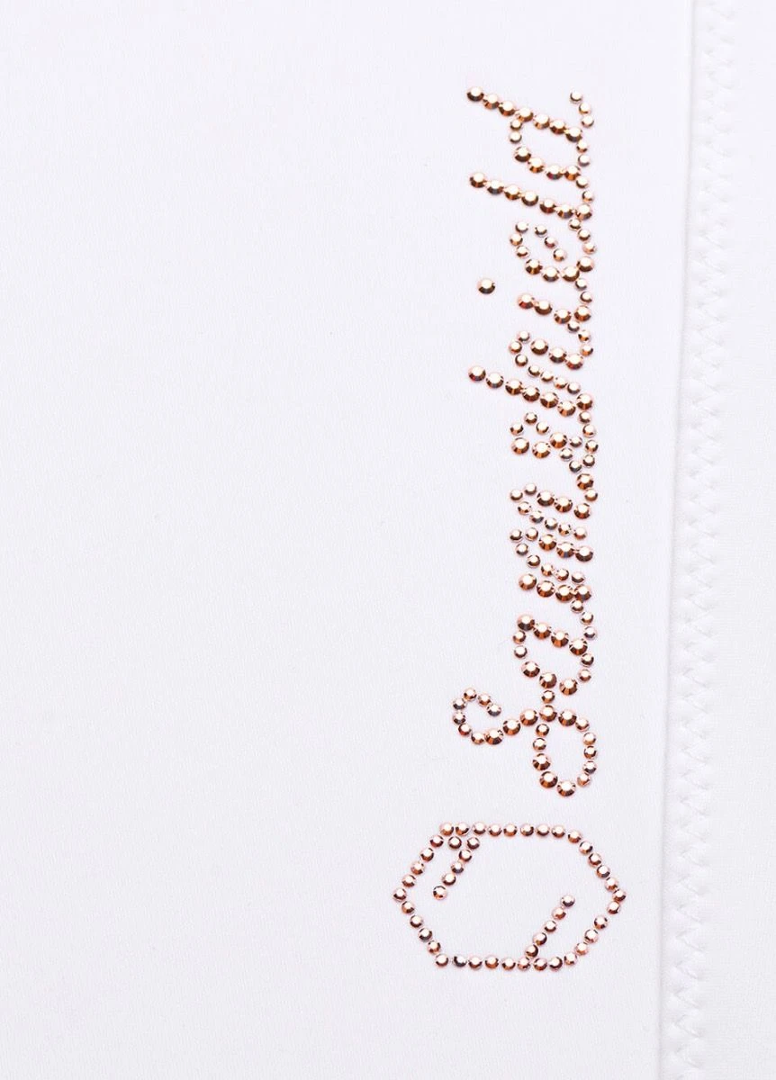 The Adèle breeches provide comfort and technical performance. The tailored design, using wearability resistant high stretch fabric along with the pleats on the back ensure a perfect fit for the rider. The Adèle breeches offer a second skin effect and guarantees high breathability for optimal comfort. The elasticated fabric provides wind and ultraviolet rays protection. The silicone knee grip ensures stability and adherence in the saddle. The compression fabric offers a perfect fit of the breeches. The elastic tape inside the belt is equipped with silicone which prevents the shirt from rising. The breeches are embellished with a Swarovski® Samshield logo on the rider’s thigh and Crystal Fabric Swarovski® on the back pockets combining technical performance and elegance.